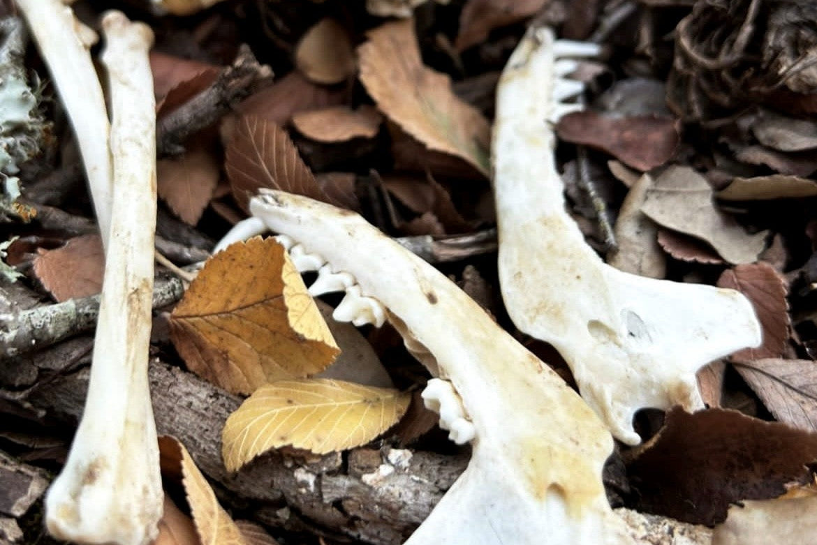 Wooded Areas - We'll traverse off trails and into wooded areas during summer and autumn months when the foliage is less dense and it's easier to find animal trails. This method is just "look around until you find something." We tend to look where other scavengers will drag a kill, or downhill where bones will naturally move and spread out. However, we do our best to avoid unearthing any bones. Sifting through leaves is one thing, but to do any digging or excessive moving of foliage works against our morals. If the bones have been buried by Mother Nature, the creature has already been laid to rest.