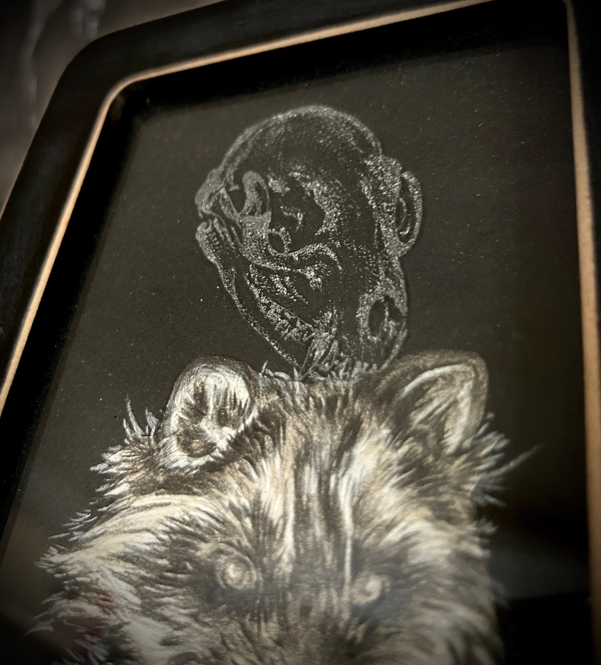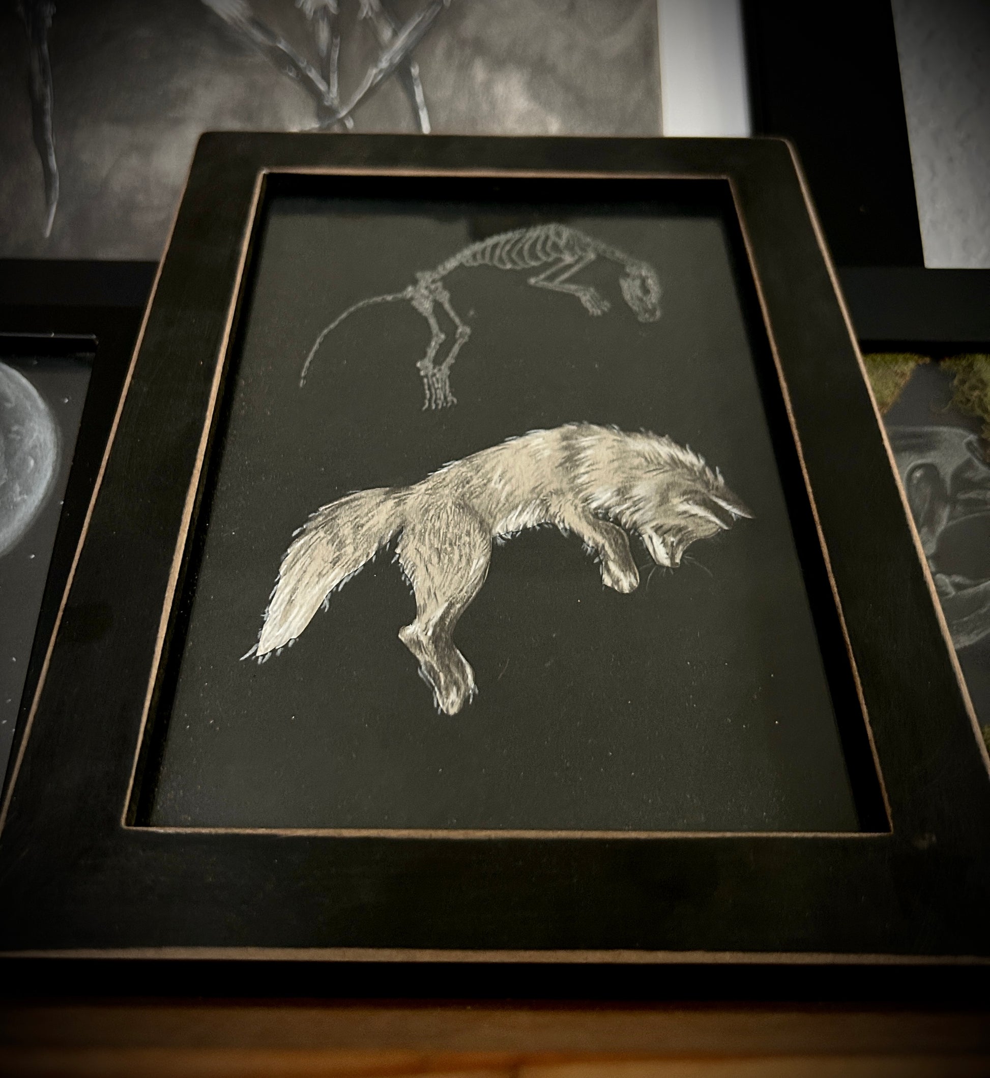 Hand-etched bones on glass. Animals were illustrated on tan paper, cut out, and blended over black paper. Unique handmade artwork.