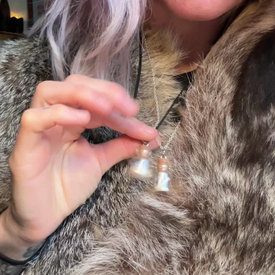 Ethically sourced bones from scavenging in tiny potion bottles. Choose either black leather or silver chain. Other colors may be available upon request.
