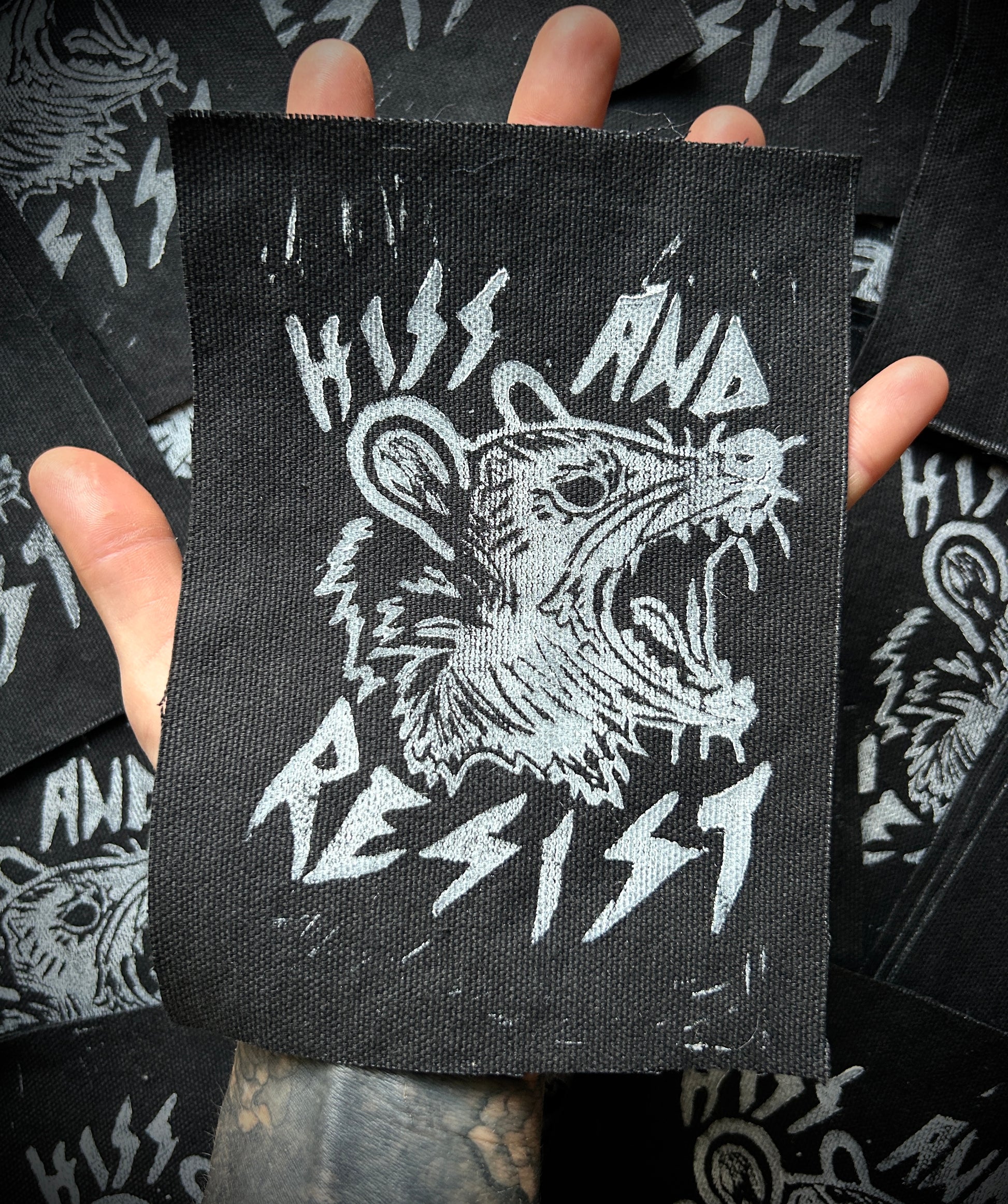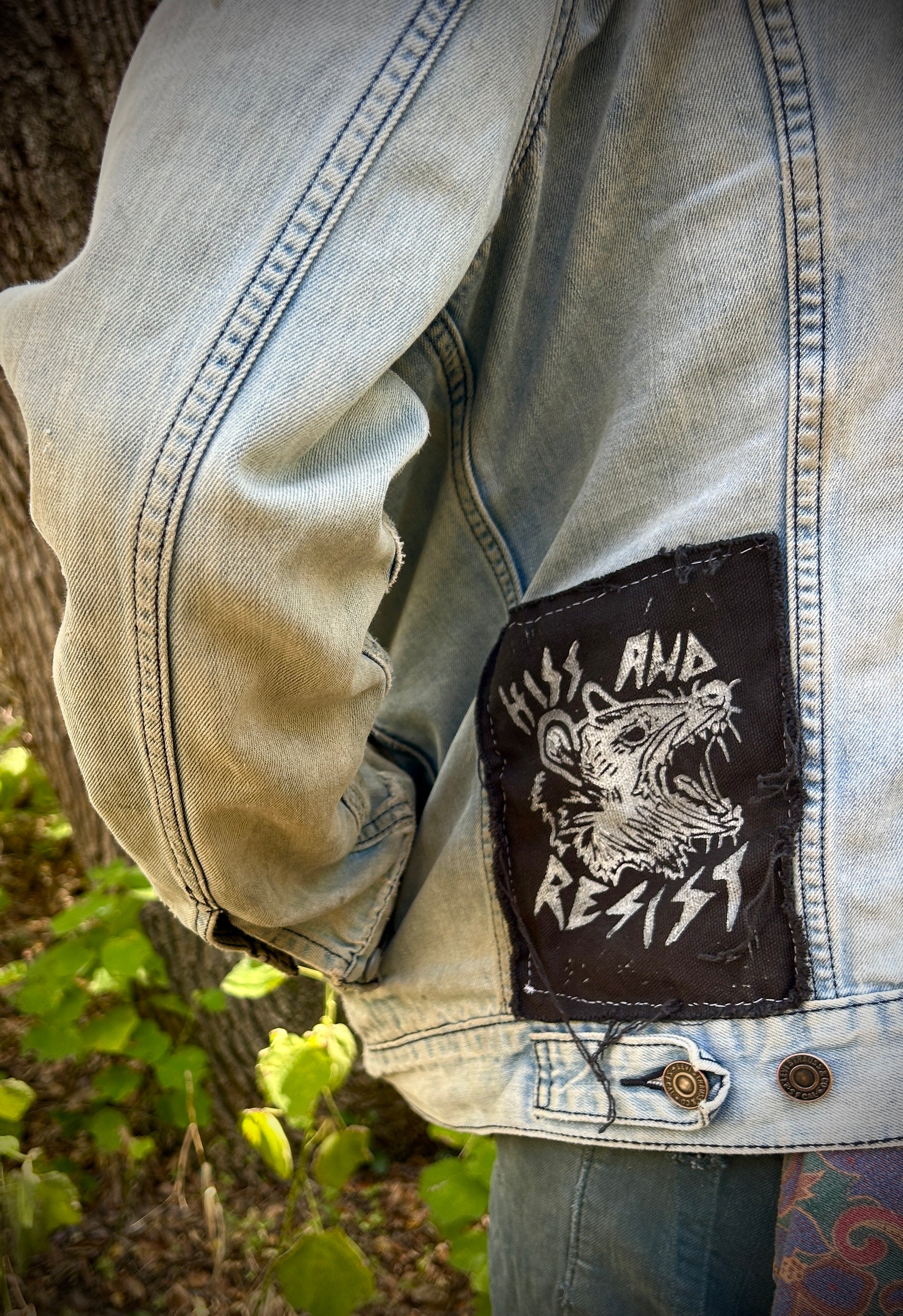Handmade block printed on black 100% cotton denim. Pre-washed, non-stretchy, with an extra fabric border perfect for sewing on jackets, bags, etc.