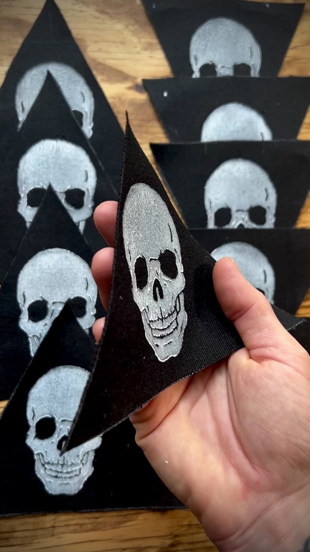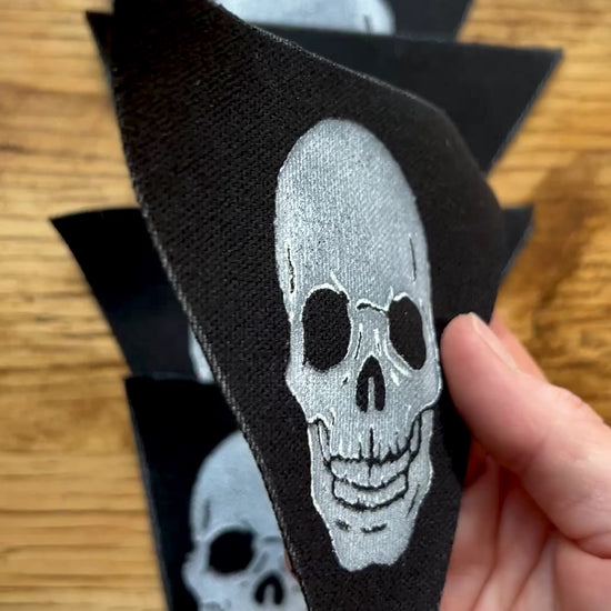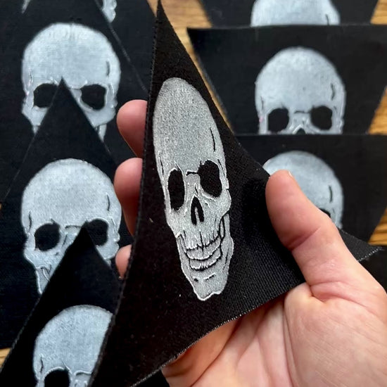 Handmade block printed on black 100% cotton denim. Pre-washed, non-stretchy, with an extra fabric border perfect for sewing on jackets, bags, etc.