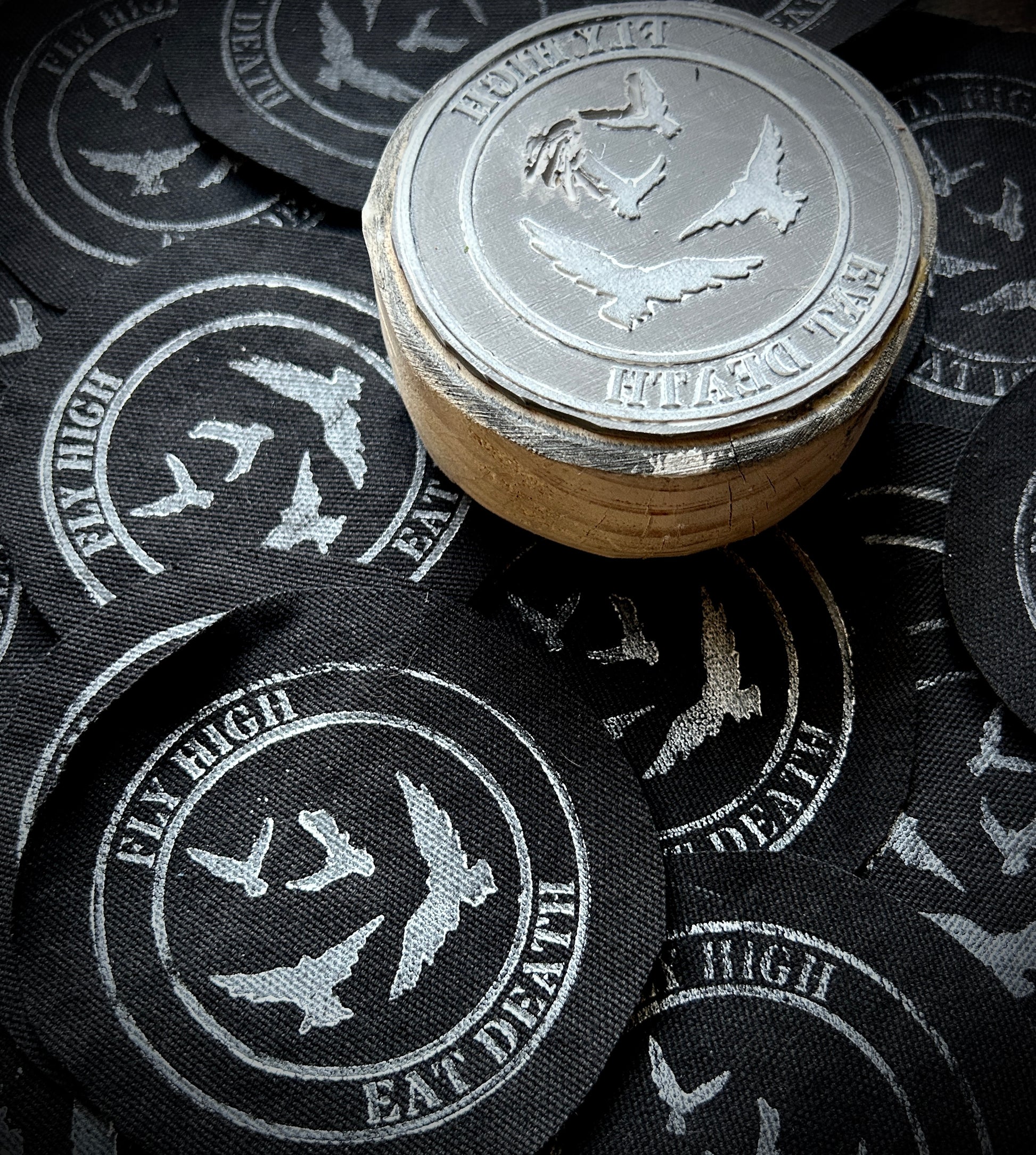 Handmade block printed on black 100% cotton denim. Pre-washed, non-stretchy, with an extra fabric border perfect for sewing on jackets, bags, etc.
